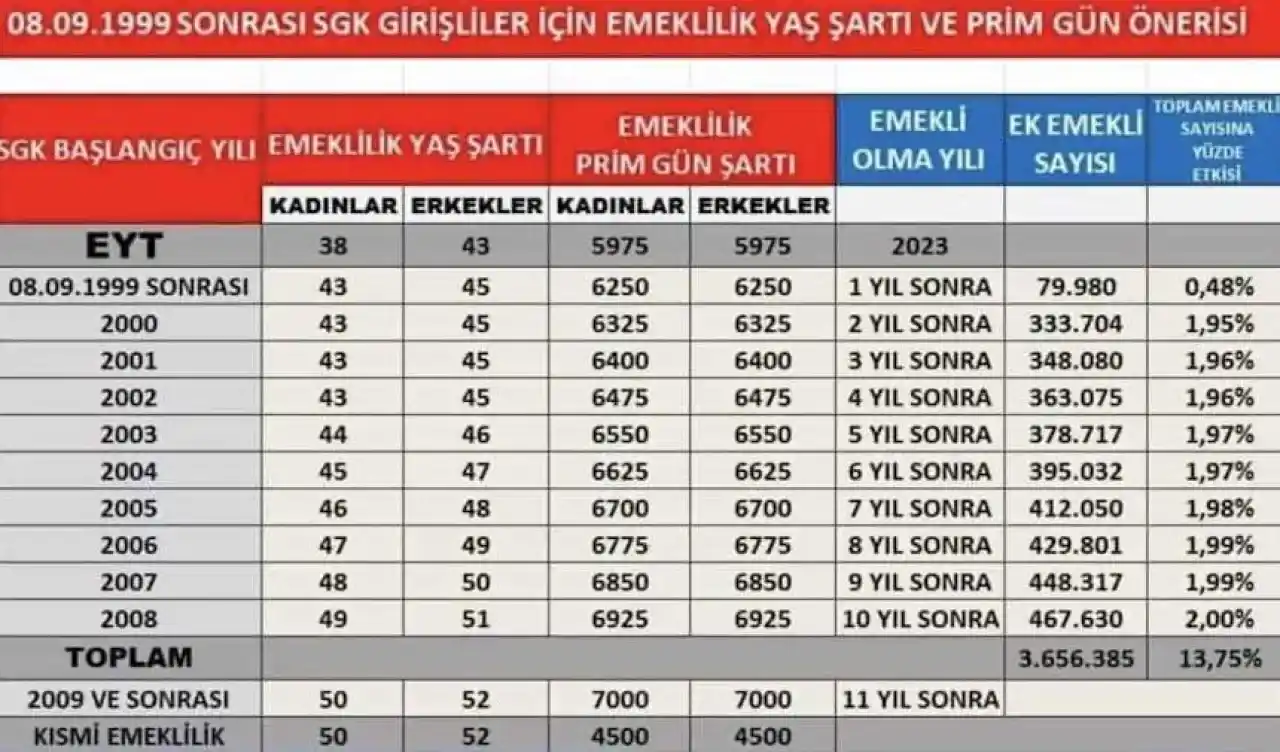 Yukarıdaki tabloya göre, işe başlangıç tarihlerine göre emekli olma yaşı, 2000 sonrasında işe başlayanlar için yavaş yavaş artmaktadır. 2000 yılından sonra sigortalı olarak işe giren bir erkek, 45 yaşında emekli olabilirken, kadınlarda bu yaş 43’tür. 2008 yılına gelindiğinde ise, emekli olmak için erkeklerin 51, kadınların ise 49 yaşını doldurması gerekmektedir.